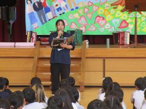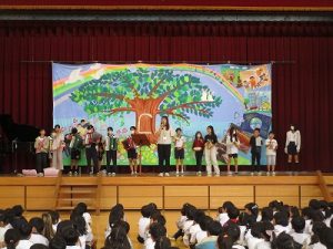 担当の先生による「ちょっといい話」と2~6年生で「みんながみんな英雄」の合唱を行いました。