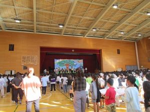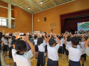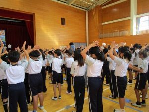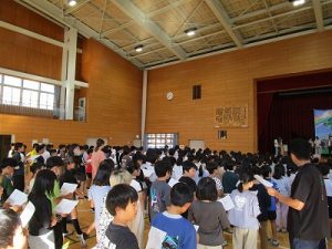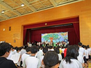 全校合唱では、元気に「みんながみんな英雄」を歌いました。途中の間奏の手拍子では、みんなで手をたたく場所を変えてみるなどアレンジも加わりながら、楽しく歌うことができました。