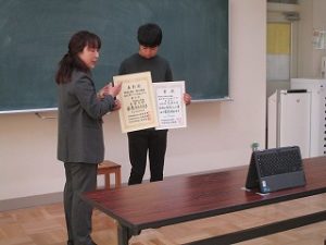 陸上記録会,夏休みの友・読書感想文コンクール,家庭の日・青少年を育む日のポスター・作文の入賞者は名前が呼ばれ,代表の児童が校長先生から賞状を受け取りました。