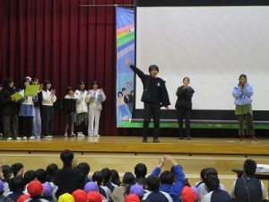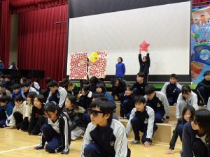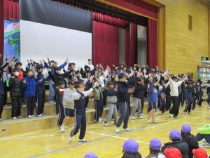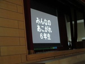 その後,体育館に集まって5年生の実行委員会により劇とクイズや,思い出のスライドを見ました。1~5年生がそろって感謝の呼びかけをしました。6年生からは,お礼の出し物がありました。さすが6年生と思わせてくれる出し物でした。