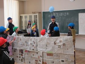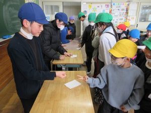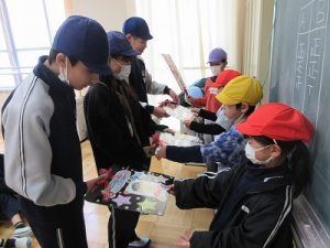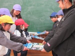 縦割り班ごとに教室で楽しいゲームやクイズなどをして6年生と一緒に遊びました。今回は5年生が中心となって感謝の会を進めてくれました。1~5年生が協力して作った似顔絵入りメッセージカードのプレゼントも渡しました。