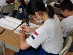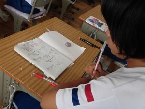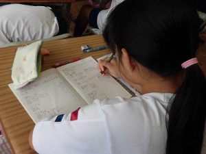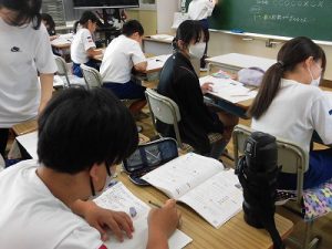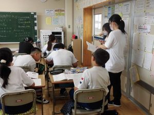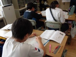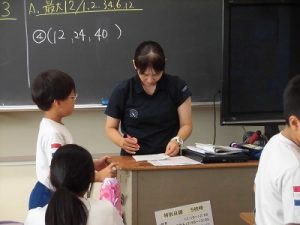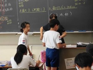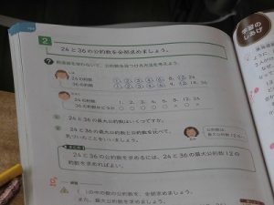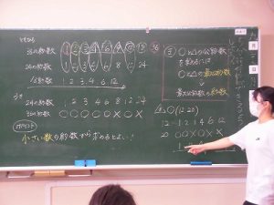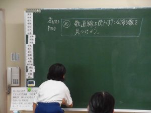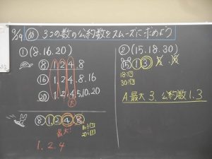 公約数 2025年10月10日 5年、算数、公約数 前時では数直線で公約数を求めていた5年生、 今回は数直線を使わずに公約数を求めます。 こんなふうに約数を書き出すんですね。 さあ、自分で解いてみよう。 隣のクラスも公約数の問題を解いていました。 3つの数の公約数もわかるかな? できたら丸をつけてもらいます。 正答率も高く、 しっかり公約数を出す方法をマスターしました。 すばらしい! 学校からのお知らせ