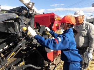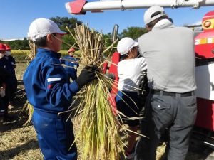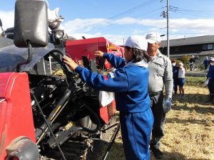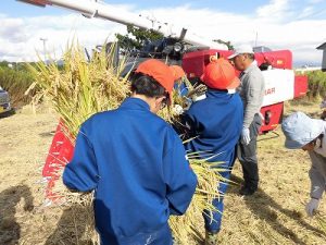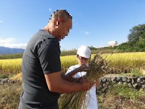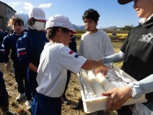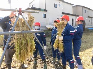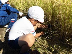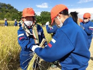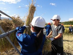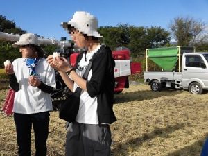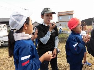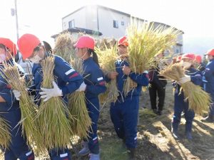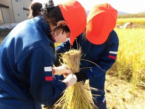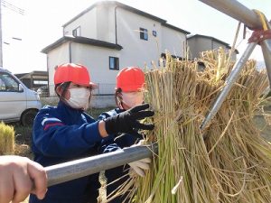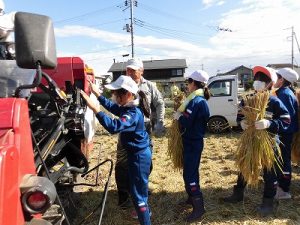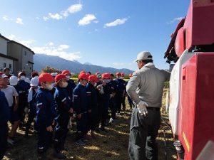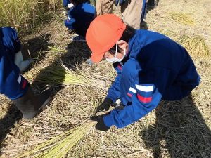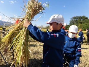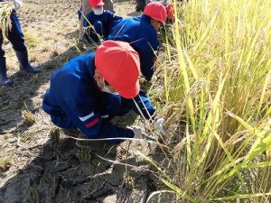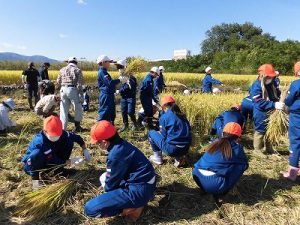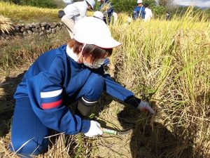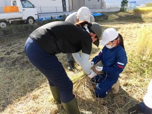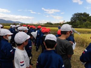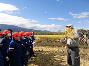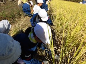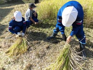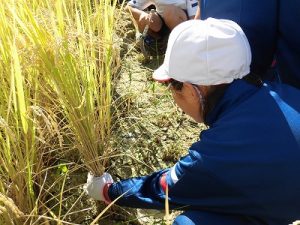 まず、学校応援団の方に稲の刈り方を教えていただきました。