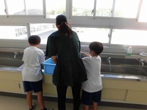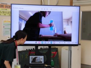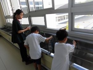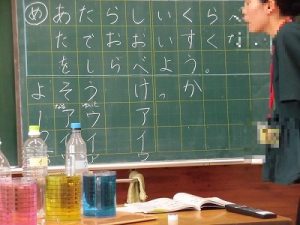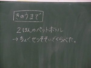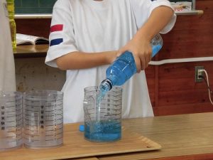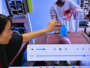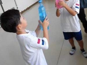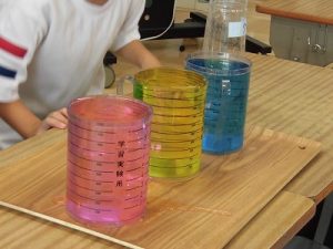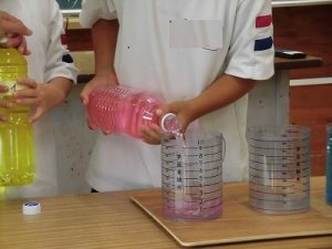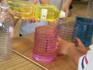 それぞれ大きさやかたちのちがうペットボトルに水をいれました。
