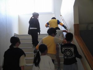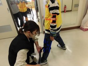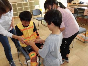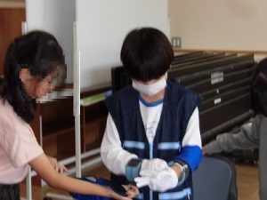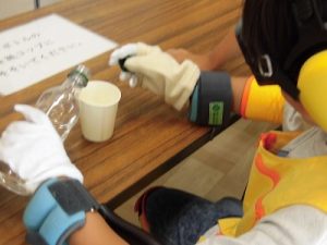 厚手の手袋をして、ペットボトルに水を注ぎます。