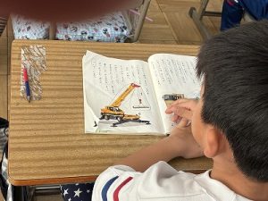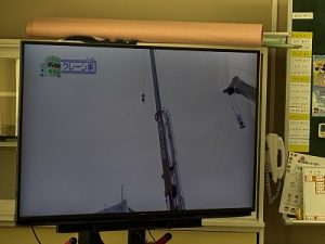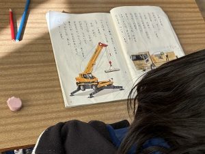 めあてが示されました。「クレーン車のしごととつくりを調べよう」