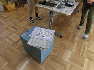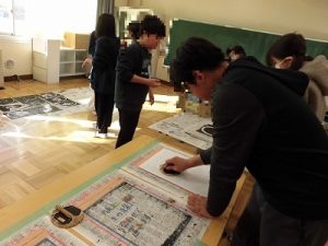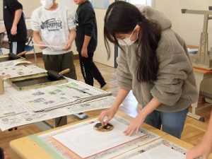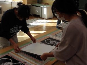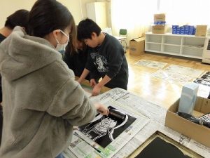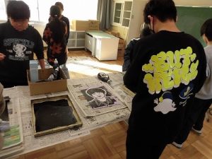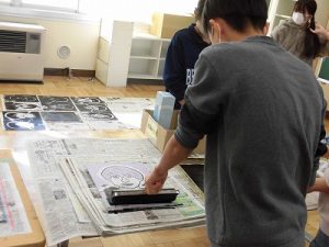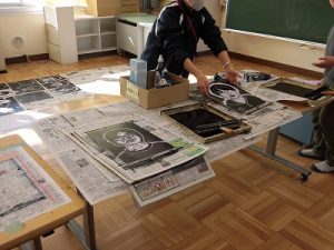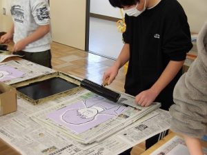 自画像 2026年02月03日 6年、図工、版画 6年生が自画像を版画で彫りました この日は印刷です ローラーでインクを伸ばし 板に平らに塗った後 協力して紙を乗せ バレンで擦ります どんな感じに仕上がるかな? なかなか似てますよ さすが6年生! 学校からのお知らせ