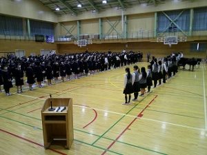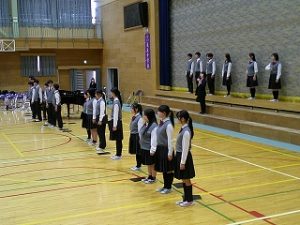高校生の大人の発声とハーモニーや強弱を意識した合唱は、生徒たちにとって良い刺激となったようです。発表の最後には、本校生徒が全校合唱を披露し、指揮の渡辺先生より発声方法や強弱のつけ方をご指導いただきました。