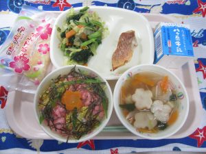 お祝いちらし寿司・牛乳・赤魚の西京焼き・菜の花和え・花麩のすまし汁・お祝いクレープ