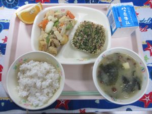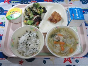 わかめご飯・牛乳・から揚げ・海藻サラダ・ワンタンスープ・はちみつレモンゼリー