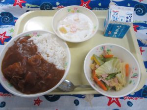 ポークカレーライス・牛乳・アスパラソテー・ヨーグルトフルーツ