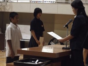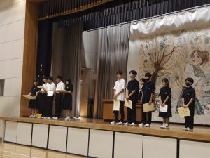 表彰式は、弁論大会や1・2年生大会の結果が表彰されました。文化の秋、スポーツの秋、今後の竜王北中生の活躍に期待しています。