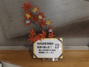 図書委員会では、秋の読書週間でお薦めの本をポスターにてお知らせしています。また、図書館までの道のりが綺麗に紅葉しています。読書の秋。たくさんの本を読みましょう。