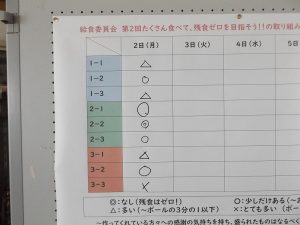 給食委員会では、残飯0を目指した取り組みをしています。いろいろなものが物価高騰していますが、改めて食材の命に感謝して食べたいですね。