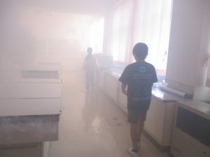 煙の中を進む体験では、煙を吸ってしまうことで苦しくなること、出入り口がわかっている場合とわからない場合で進み方に違いが出ることを学習しました。実際に火事が起きて煙の中を進む時のイメージ力を高めながら、実践を意識した訓練をすることができました。訓練には実際をイメージしながら行うことの大切さをしっかり学ぶことができた貴重な機会になりました。