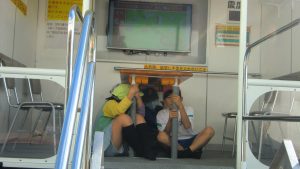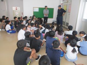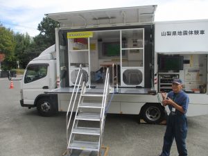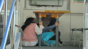 地震体験車に乗り、海側で起こる地震(揺れが強くなったり弱くなったりが繰り返される)を体験しました。最大で震度6強までの揺れを体験し、子どもたちは大きな揺れによって体が流されないように机の脚にしっかりとつかまり、必死に耐え、実際にこんな大きな揺れがあったらどうなってしまうのか・・・と考えながら取り組んでいました。大きい揺れの恐ろしさを身をもって感じることができました。