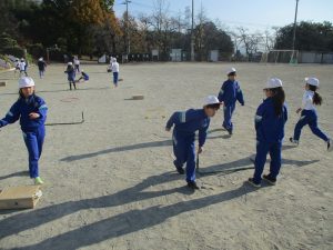 また、ハードルの授業では、はじめは障害物を飛び越えるだけの動きが、回数を重ねるにつれて、友達と気づいたことを伝えあいながら取り組み、上達することができました。授業を進めていく中で、友達との教え合いを重ねた結果、子どもの中から「うまくできた」という声が増えてきたように思えます。また、上手にできた友達に、ハイタッチや上手にできたポイントを伝える姿も見られました。