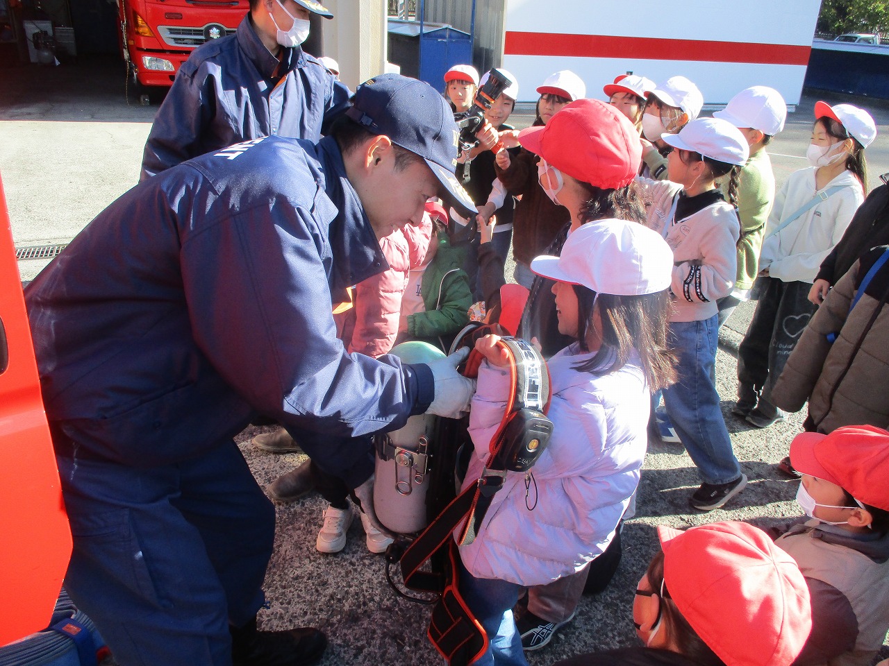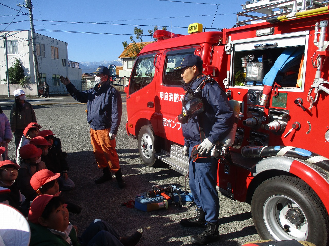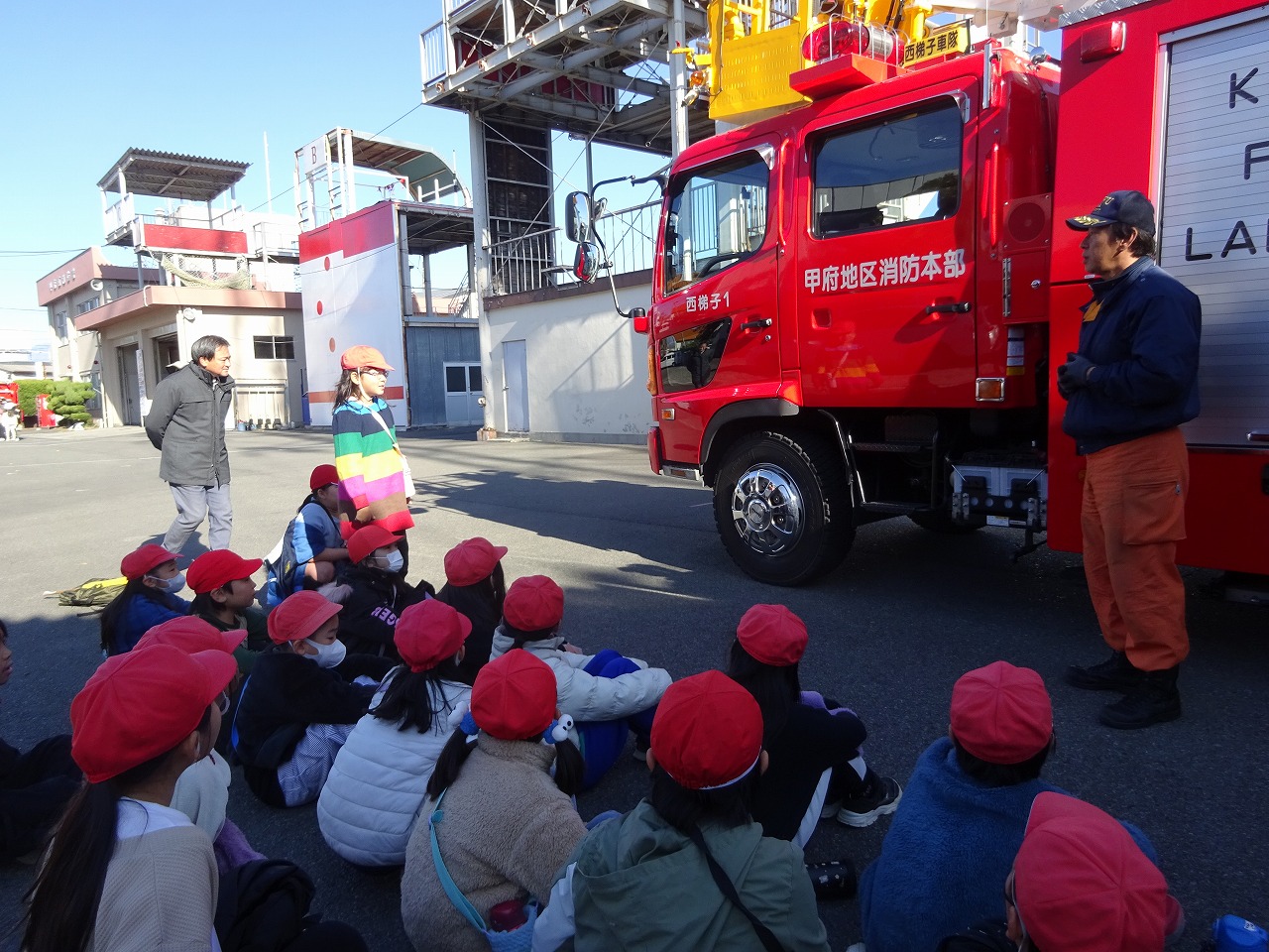 3年生 校外学習 甲府西消防署に行ったよ 2025年12月09日 12月9日(火)に甲府西消防署へ見学に行きました。ポンプ車とはしご車が使われる場面や消火活動に使われる道具についてわかりやすく説明してもらいました。様々な火災を想定し、日頃の訓練と点検を欠かさないことがわかりました。そのおかげで迅速かつ安全に消火活動が行えることがわかりました。普段見ることのできない貴重な体験ができたので、これからの学習にいかしていきたいです。 今回、ご協力していただいた甲府西消防署の皆様、ありがとうございました。 学校からのお知らせ