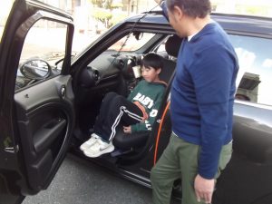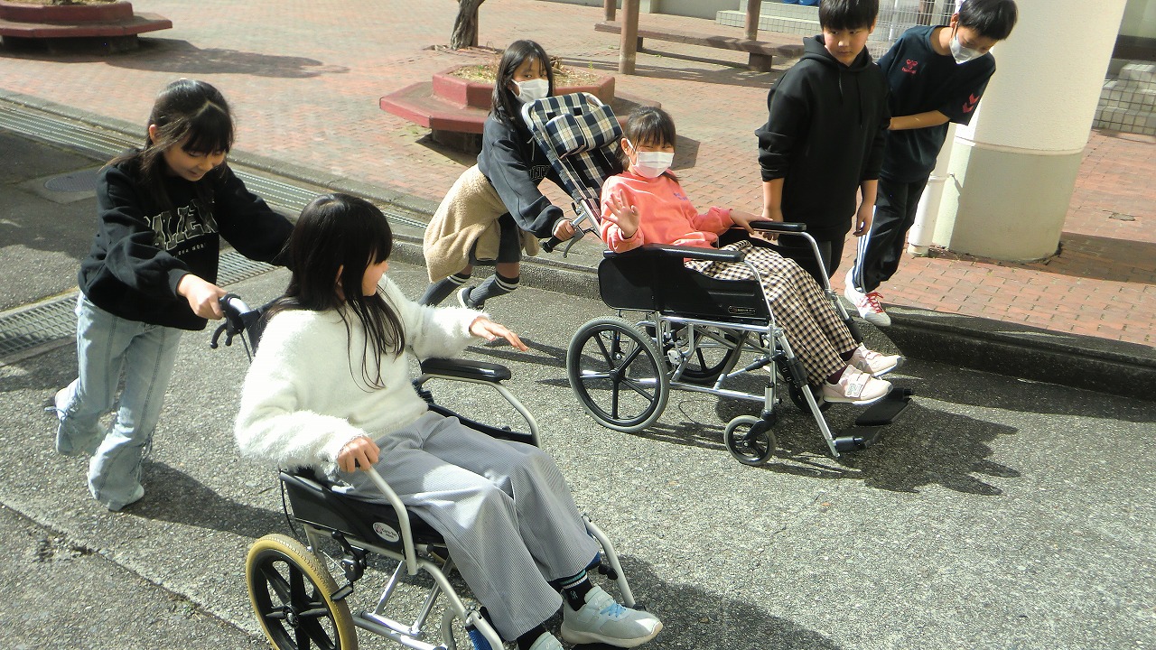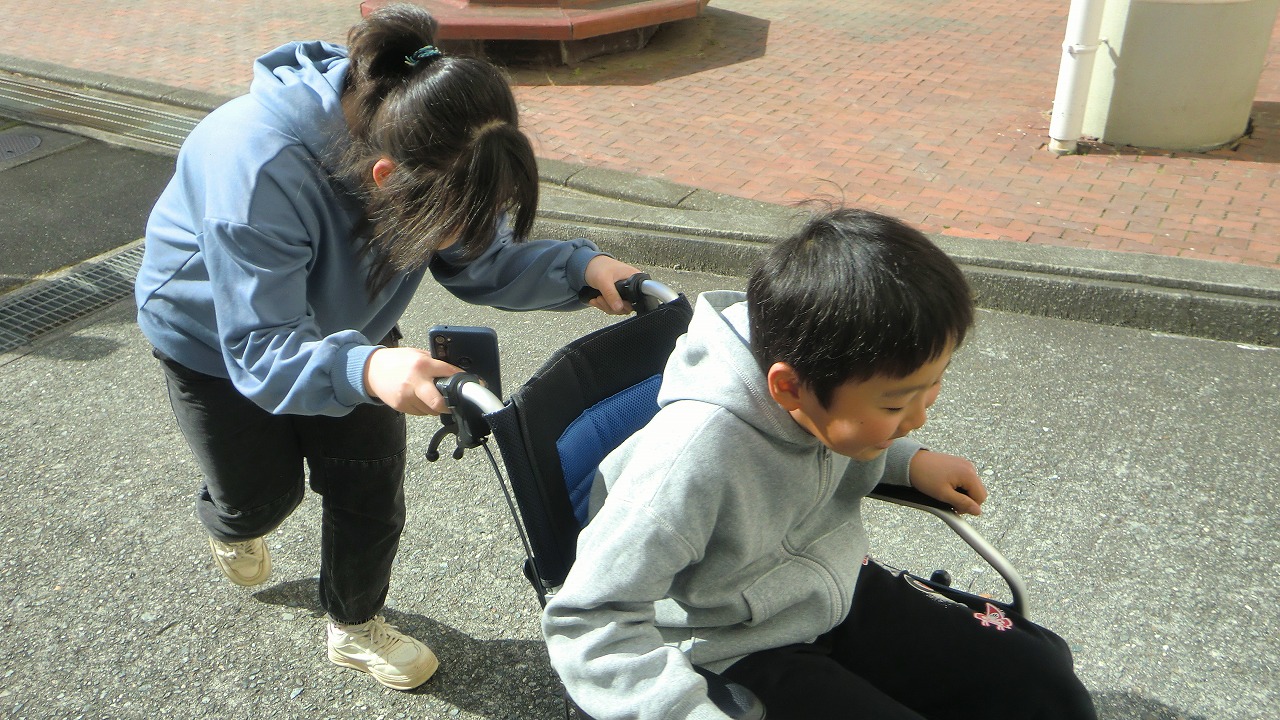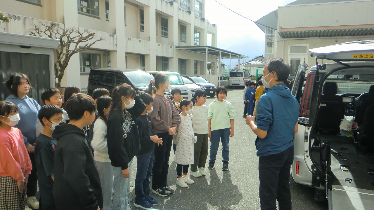 4年生は福祉学習の一環として、車いす・ストレッチャー、障がい等のある方に向けて改造された福祉車両に乗る体験をしました。子どもたちは、世界に1つしかない福祉車両に興味津々で、ボタンでシートが回転したり、ハンドルに運転補助装置が付いていたりしているのを見て、おうちの車との違いに驚いていました。車いすやストレッチャーに乗ってみると普段経験しない感覚を覚え、「少しこわかった」や「段差があるときに押すのが大変だ」ということを身を持って感じていました。この経験を忘れずに今後の福祉に対しての理解をさらに深めていってほしいと思います。