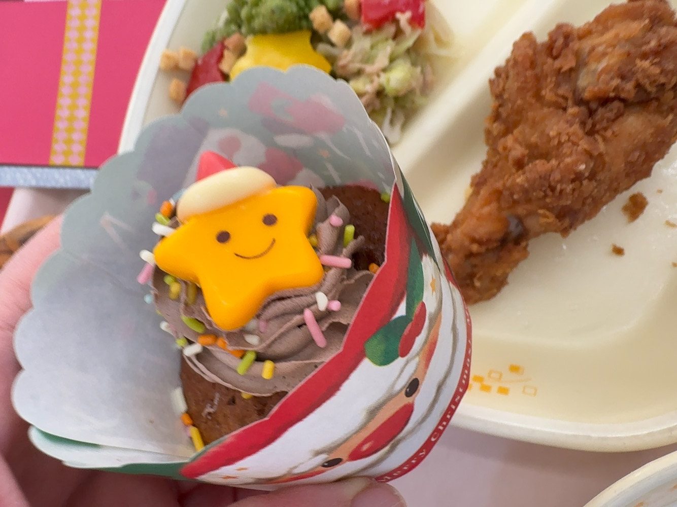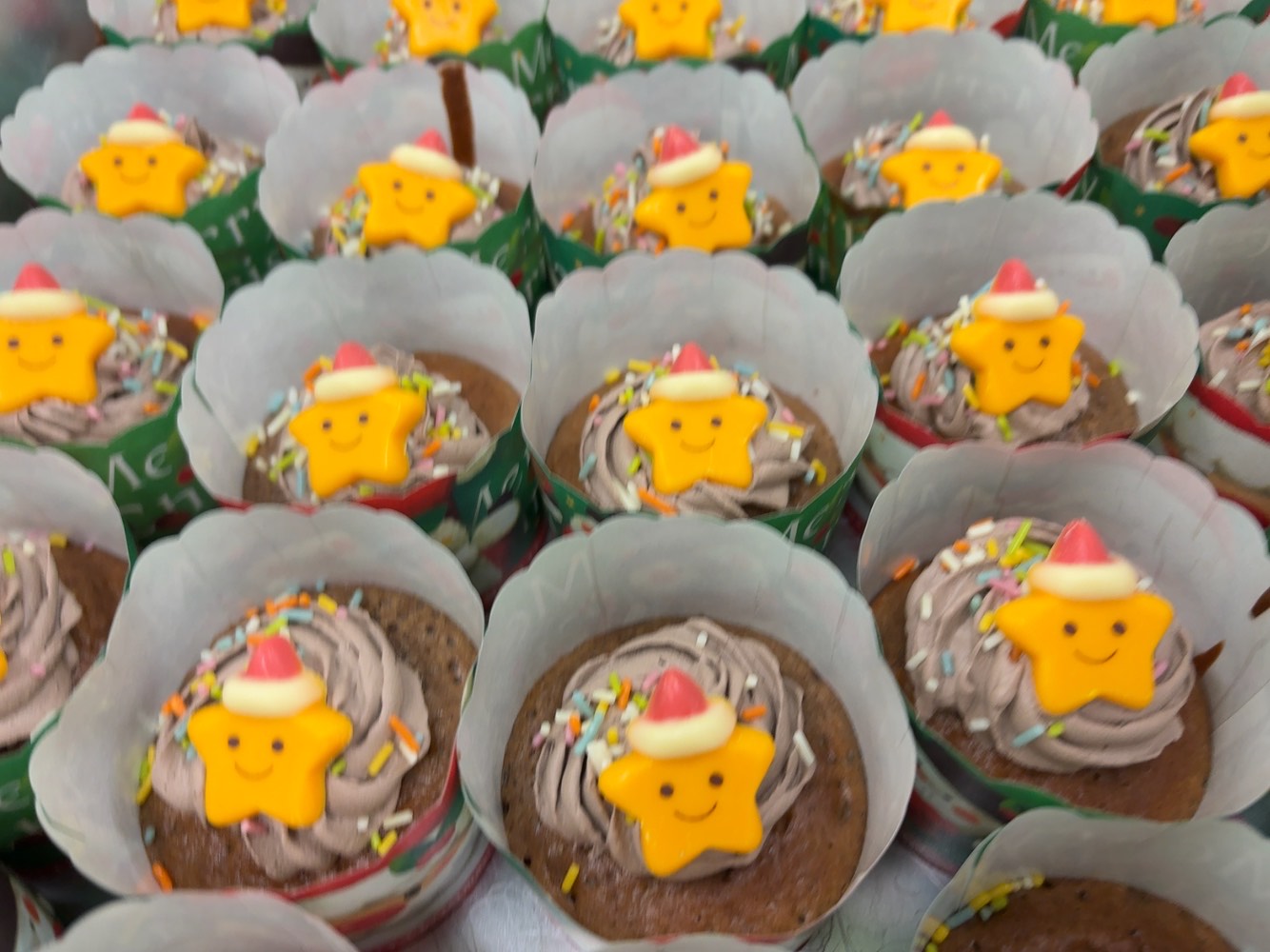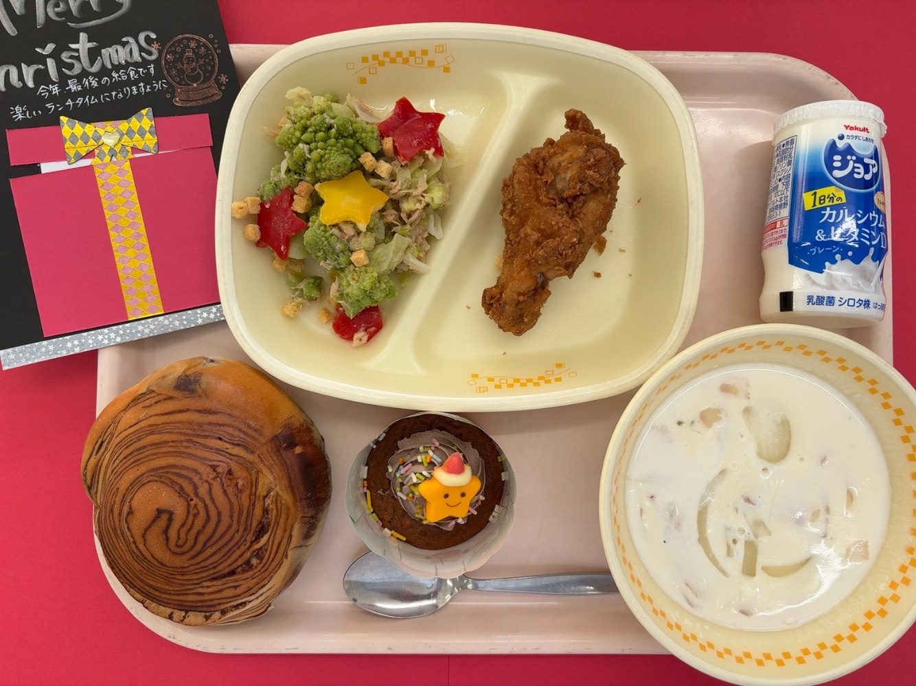 星形に抜いたパプリカで彩ったサラダ、オリジナルスパイスのザクザクチキン、クリーミーなスープ、そして、かわいいふわふわのクリスマスケーキ。献立表に花丸をつけて楽しみにしてくれていた児童や、給食前に会うとニコニコの笑顔で「早く給食を見たい」と話してくれる児童の姿もありました。