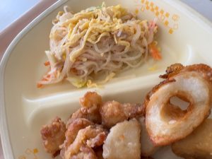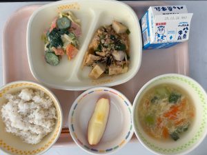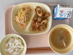 今日の給食は「イカのから揚げ」がとても柔らかく仕上がり、かみやすくて食べやすいと好評でした。副菜の「つるしゃきあえ」には、もずくやしらたきの“つるっと”した食感と、きゅうりの“しゃきっと”した食感がよく合い、甘酸っぱい味つけも児童に人気でした。
