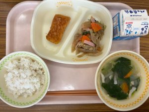 10月1日牛乳、麦ごはん、おみそ汁、かじきのかりん揚げ、おかか炒め。カリっと揚げた白身魚に、甘めのしょうゆダレをからめた「かりん揚げ」。魚特有のにおいがなく、魚が苦手な児童も食べやすい一品に。家庭では少し手間のかかる魚の揚げ物も、給食ならではの工夫でよく提供することができます。給食を通じて、子どもたちの食の選択肢が少しずつ広がっていくと嬉しいです。