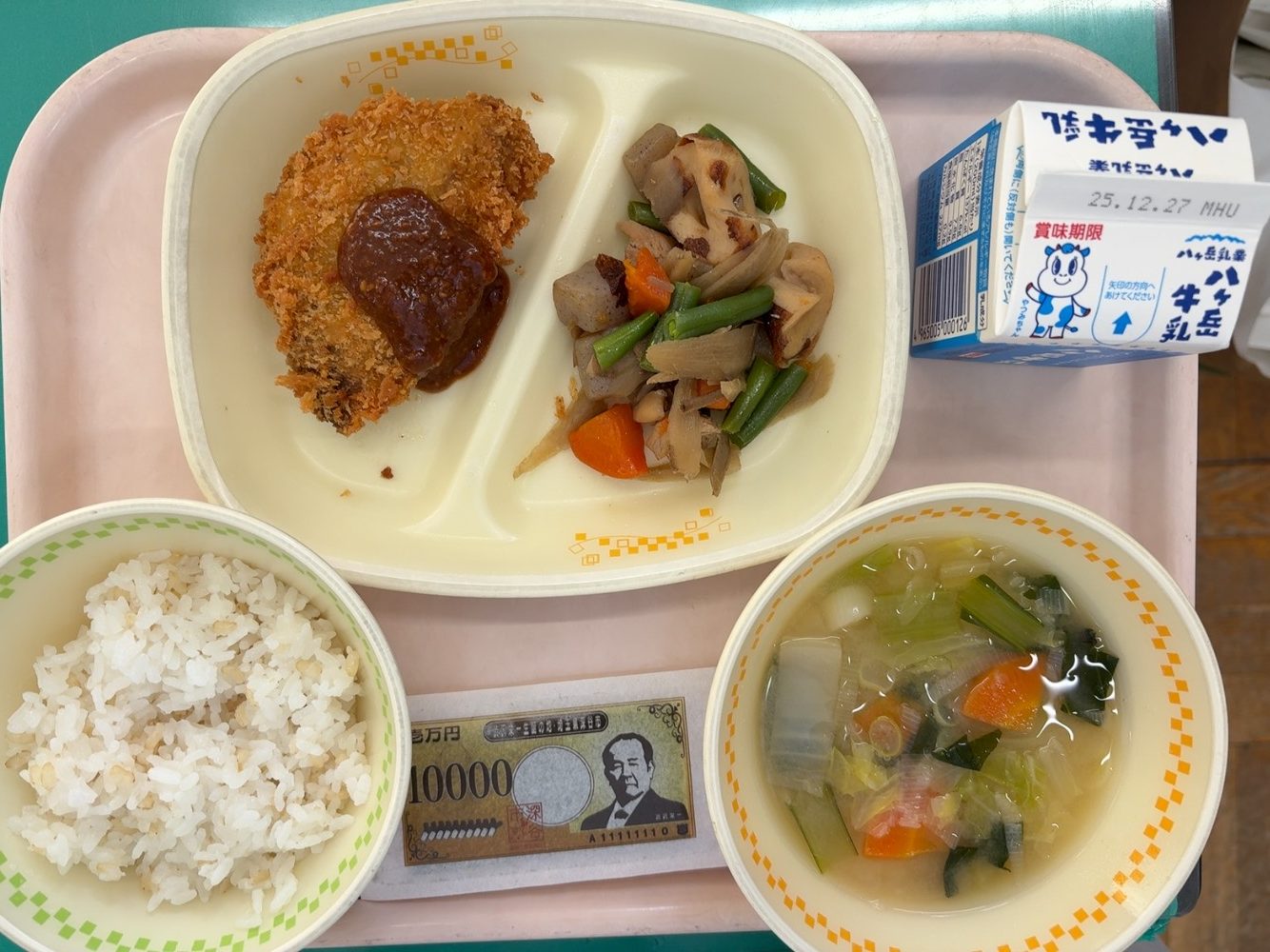 10月28日麦ごはん、おみそ汁、八幡いもコロッケ、ごぼうサラダ。教室にお邪魔すると、担任の先生が、調理員さんのことを子どもたちにコロッケを汗をかきながら、みんなのために朝早くから給食を作ってくれていることを離してくれていました。別のクラスでは、子どもたちが給食室の方を見て、自分たちから「いただきます」「ごちそうさま」と挨拶。先生方の丁寧な指導のお陰で生まれた感謝の気持ちは、給食に限らず、人や物に対しても自然に広がっていく——そんな良い循環が生まれてくれているそんな風に感じます。