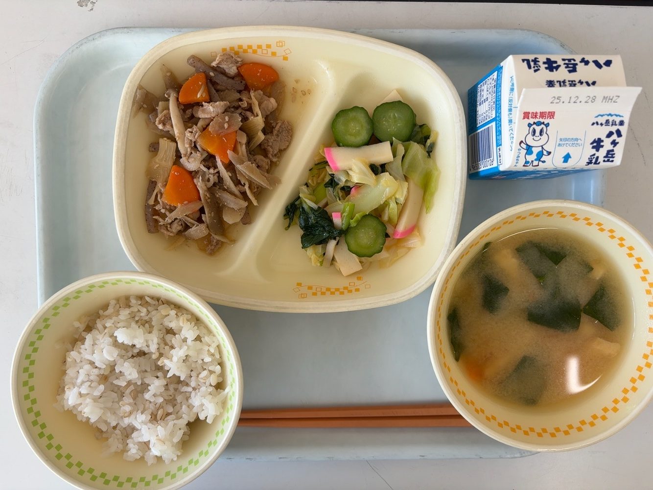 12月1日牛乳、麦ごはん、おみそ汁、すき焼き風煮、寒天サラダ。最近、本校でも感染症が流行しています。給食の前には、いつもより丁寧に手を洗うことで、自分の体を守ることができます。また元気に学校生活を送るためには、バランスのよい食事が欠かせません。給食は、子どもたちがさまざまな食材を味わい、健康な体づくりにつながる大切な時間です。楽しく過ごすことも免疫力アップには重要、楽しくておいしい給食の時間で元気に過ごしてもらいたいです。