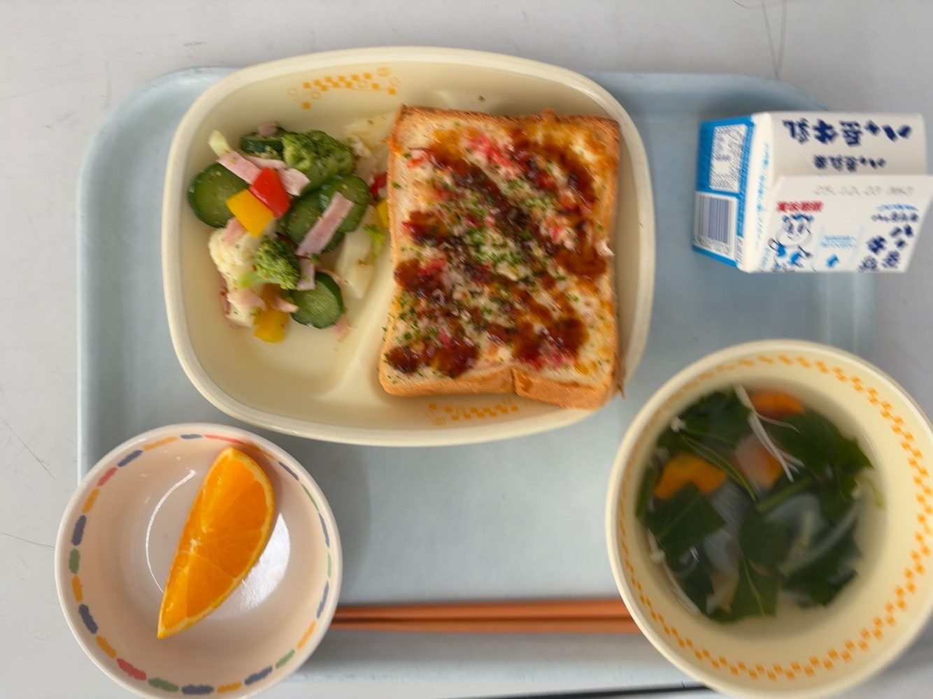 7月6日牛乳、ミルクスイーツ(もも?)、ミネストローネ、マスタードサラダ、カレーパン風トースト?です。今日は初挑戦のカレーパン風トースト。炒め玉ねぎでコクを出したカレーを食パンに塗って、パン粉とチーズ?をトッピング。カレーの豊かな香りと、チーズのコクで上手に仕上がりました。ピリ辛でおいしいーよと児童も言ってくれ、好評でよかったです。1度やってみると、次回の課題もみえてきます。今後も食材、調理法、バラエティー豊かに給食が提供できるよう努力していきたいと思います。