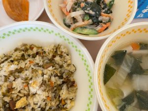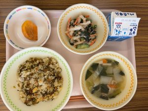 12月9日牛乳、ワンタンスープ、高菜ご飯、ツナサラダ、柿。高菜がたっぷり入った高菜ごはんは、ごま油が香り食欲がそそられます。2学期の給食の残り僅かになっていきました。爆発的な感染症の流行もなく過ごせていますので、このまま穏やかに終業式を迎えられる事を願っています。