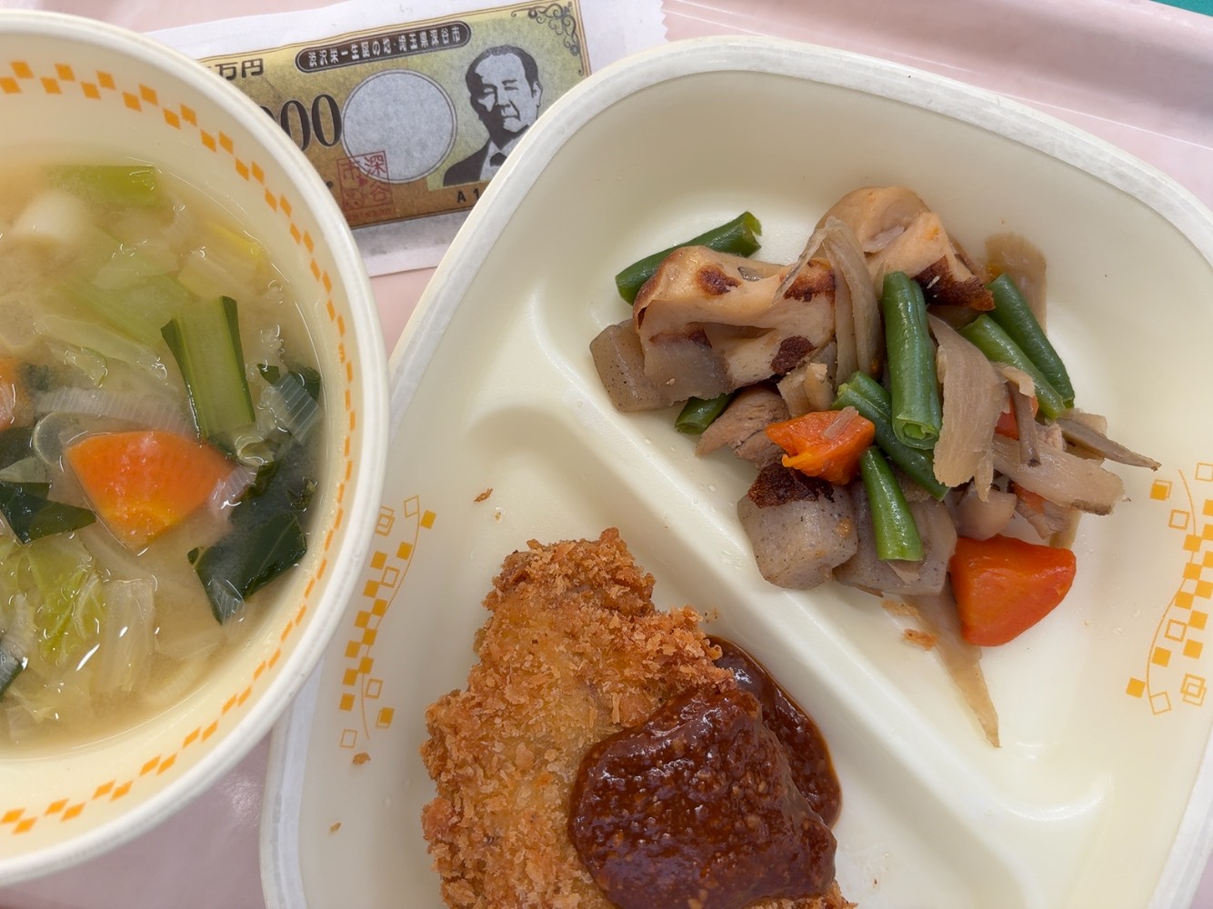 10月6日もち麦ご飯、もずくスープ、手作りメンチカツ、大根ホタテサラダ。今日はメンチカツを手作りしました。キャベツがたっぷり入って野菜の甘さとお肉のジューシィーなうま味、衣のサクサク食感。がぶりと一口頬張ると幸せな味が口に広がりました~。工程が多いメンチカツをすべて手作りで作ってくれた調理員さん、今日は特にお疲れ様です✨おいしかったです!ごちそうさまでした?