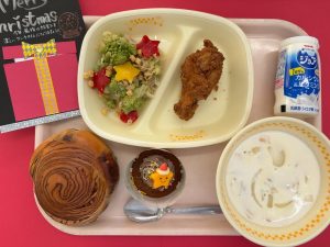 12月18日ジョア、クラムチャウダー、手作りフライドチキン、ツナサラダ、チョコクルクルパン、手作りクリスマ