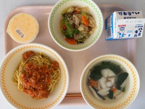 5月28日牛乳、ハニーレモントースト?、ソーセージスープ、ポテトのナポリ風、フルーツヨーグルトです。固めに炒めたじゃがいもはケチャップで味付けしてまるでナポリタンの味です。優しい甘さのトースト、さっぱりクリーミーなヨーグルトとあわせ、見た目もカラフルな給食でした。
