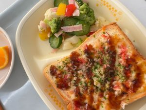 キャベツやエビなど、お好み焼きでおなじみの具材をのせたトーストで、甘じょっぱいソースはまさに魔法のソース。仕上げの青のりとかつお節の香りも後押しして、どのクラスも気持ちよくお皿を空にしてくれました。