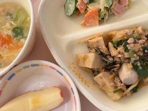 12月15日牛乳、麦ごはん、卵スープ、麻婆里芋、中華サラダ、りんご。今日は甲斐市の特産物、八幡いもを麻婆にしました。和風のイメージが強い里芋もいろんなアレンジを加え児童に親しみやすいように提供しています。