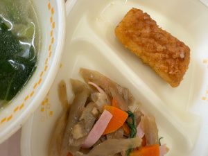 5月14日牛乳、手作りコロッケ、デニッシュ?、野菜スープ、スモークチキンサラダ、りんごヨーグルトです。手作りのコロッケは、ほっくほっくのじゃがいもにサックサックの衣ボリューム満点のひと品です。中身の重量感と衣のバランスが絶妙でした。またりんご?ソースをいれたスモークチキンサラダが口の中を爽やかにさせてくれました。