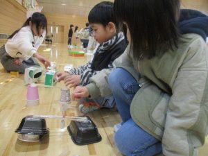 2年生は生活科の「うごくうごくわたしのおもちゃ」の学習で、磁石やゴム、おもり、風の力を利用したおもちゃを試行錯誤しながら作ってきました。