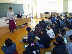3学期の総合では、「みんなで生きる町」というテーマのもと、福祉について学習しています。実際に講義に来ていただいたり、白状を使った体験をしたりしながら学びを深めることができました。