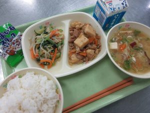 献立は、ごはん 肉豆腐 小松菜とツナの和え物 ごまみそ汁 おさつスティック 牛乳でした。