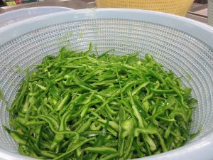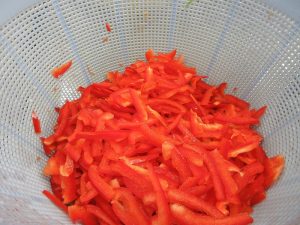 「チンジャオロース」のピーマンとパプリカです。細いせん切りにします。