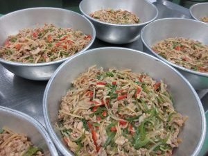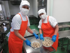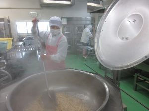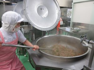 もやしとピーマンは別の釜で炒めます。味をつけたお肉と合わせて出来上がりです!