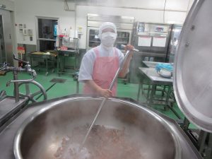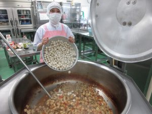 鶏肉とごぼうを香りよく炒めて、だしと一緒に材料を煮ていきます。山梨県産の「玄米だんご」も入れました。