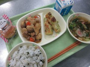献立は、わかめごはん ちくわの磯辺揚げ 芋炊き もずくスープ シュークリーム 牛乳でした。