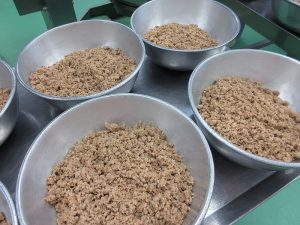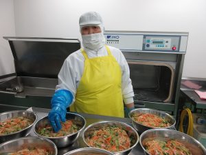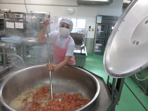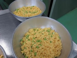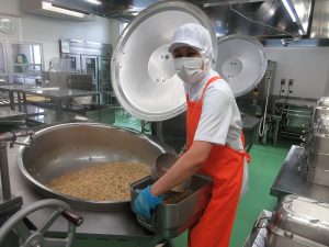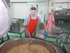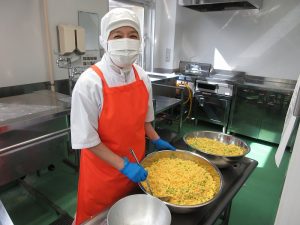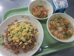 今日の給食は、ごはんと混ぜて食べるそぼろ丼です。