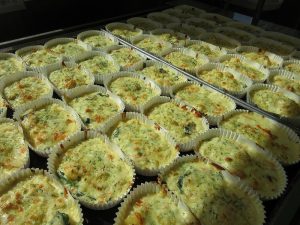「白身魚とほうれん草のグラタン」です。玉ねぎがこげないようによく炒めます。角切りの白身魚は、オーブンでしっかり焼きました。