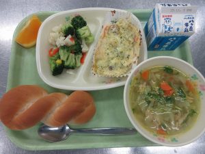 献立は、ミルクパン 白身魚とほうれん草のグラタン カラフルサラダ カレースープ オレンジ 牛乳でした。