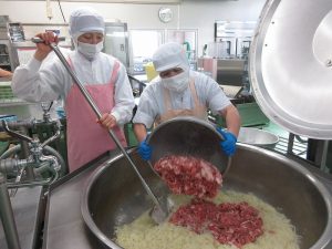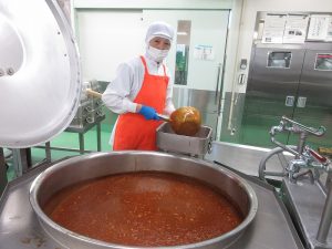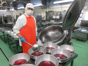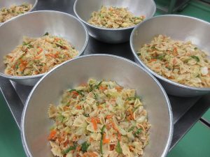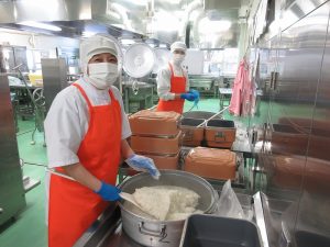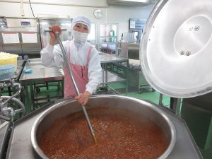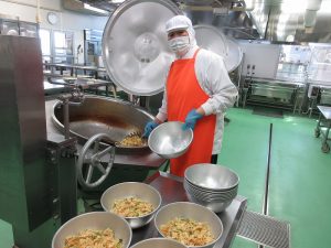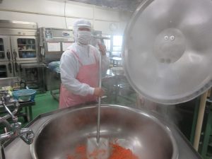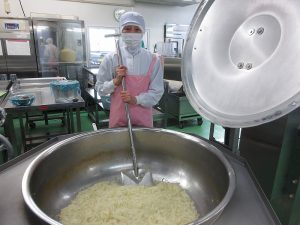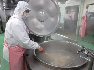回転釜で、野菜とツナを炒めて、マカロニと合わせます。