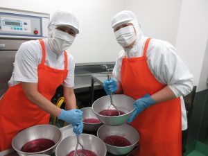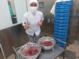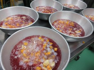 今日のデザートは「フルーツポンチジュレ」です。グレープゼリーをつくって、固まったらクラッシュします。