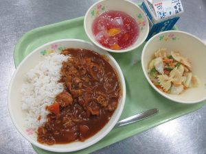 献立は、ハヤシライス キャベツとツナのマカロニソテー フルーツポンチジュレ 牛乳でした。