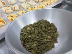 かぼちゃの種をのせます。小さなかぼちゃに見立てた「パンプキンパイ」です。